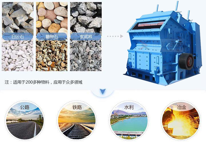 高效節(jié)能,進(jìn)料口大、破碎腔高、適應(yīng)物料硬度高、塊度大、產(chǎn)品石粉少。