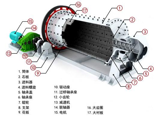棒磨機工作時,由電機通過減速機及周邊大齒輪減速傳動或由低速同步電機直接通過周邊大齒輪減速傳動,驅(qū)動筒體回轉(zhuǎn)。筒體內(nèi)裝有適當(dāng)?shù)哪サV介質(zhì)-鋼棒。磨礦介質(zhì)在離心力和摩擦力的作用下,被提升到指定高度,呈拋落或泄落狀態(tài)落下,被磨制的物料由給礦口連續(xù)的進入筒體內(nèi)部,被運動的磨礦介質(zhì)所粉碎,并通過溢流和連續(xù)給礦的力量將產(chǎn)品排出機外,以進行下一段工序作業(yè)