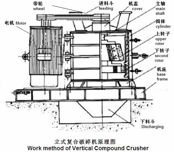 電動(dòng)機(jī)帶動(dòng)轉(zhuǎn)子在破碎腔內(nèi)高速旋轉(zhuǎn)。物料自上部給料口給入機(jī)內(nèi),受高速運(yùn)動(dòng)的錘子的打擊、沖擊、剪切、研磨作用而粉碎。