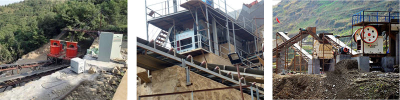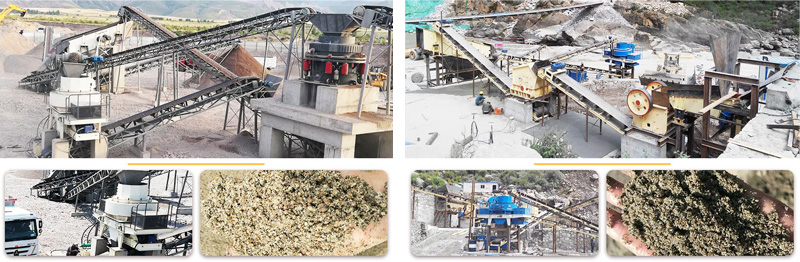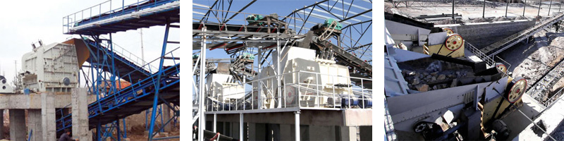 石料由振動給料機均勻的送到顎式破碎機進行粗破,粗破后的物料送進細顎式破碎機或反擊式破碎機進行再次破碎,